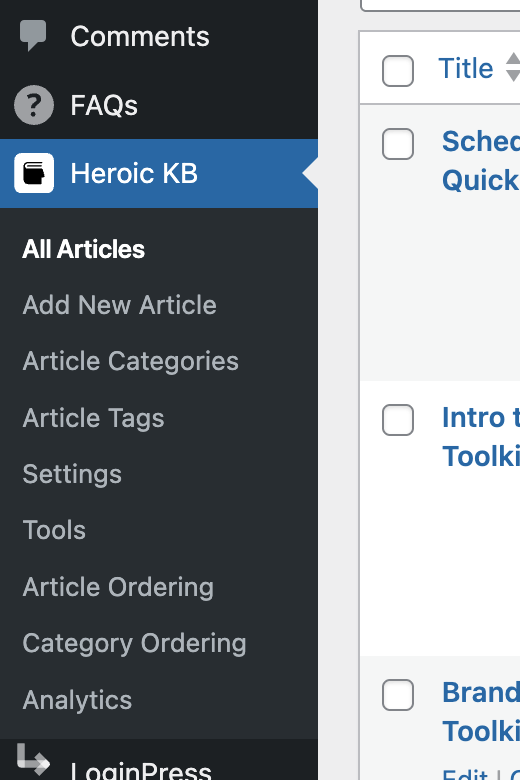 To add an article, hover over the Heroic KB module in the left navigation, and click on “Add New Article” or “All Articles“.