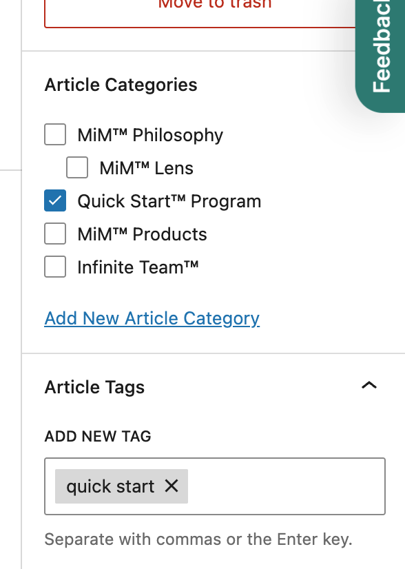 Ensure you add Article Categories and Article Tags by selecting and typing in the editing column.