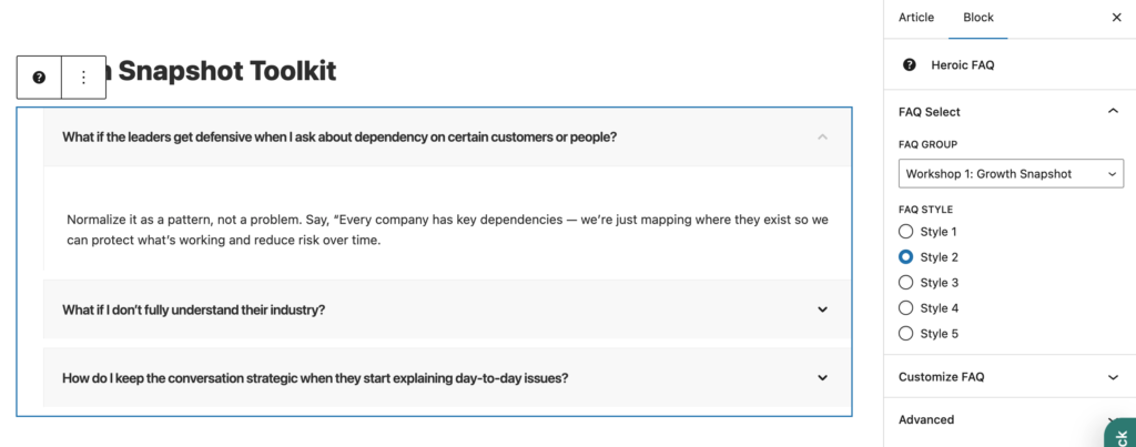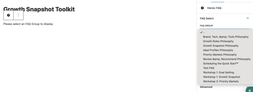 To add this FAQ Group to your Article, you’ll need to navigate back to the article you want to add it to. Add the block “Heroic FAQ“.